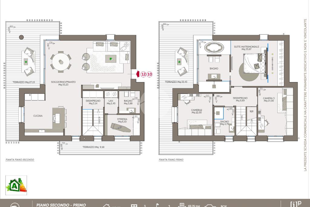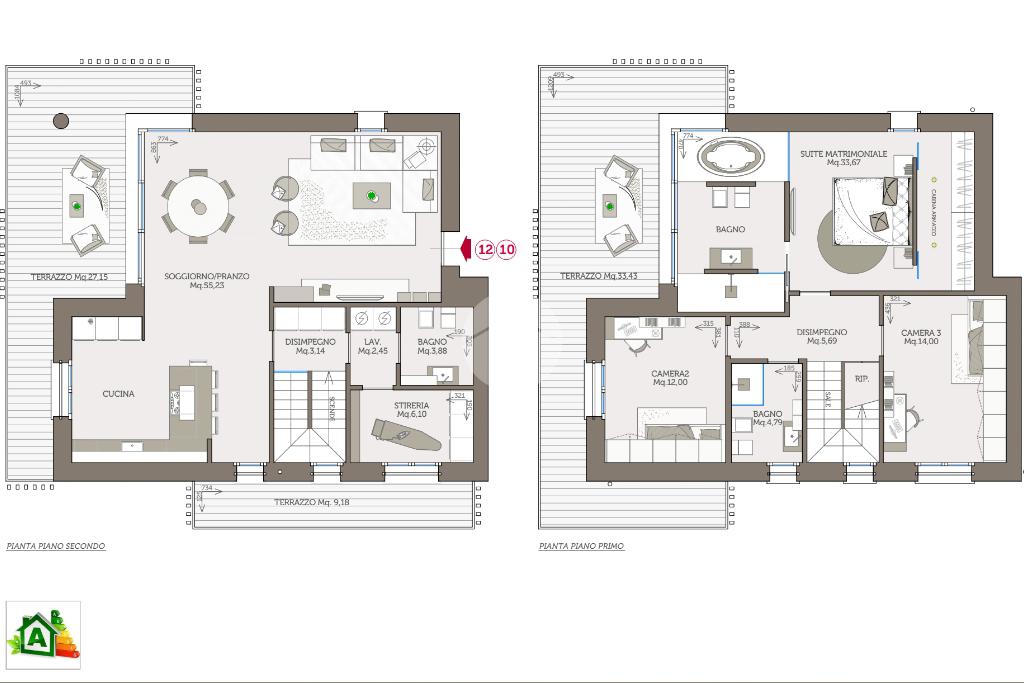 L’abitazione si sviluppa tra piano primo e piano secondo per una superficie interna di circa 193 mq, impreziosita da tre terrazzi per oltre 69 mq complessivi.